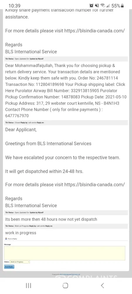 I was looking for book an appointment for indian visa application. I called bls Calgary they said there is no appointment available but we can book courier service for you to pickup and drop off. So they booked it for me. Purolator picked my daughter's application and delivered it to Surrey bls on Oct 5th 2022 which was received by jayshri at bls surrey. But till today the status of application shows "no record found" I called on bls help line number from last 3 weeks they last week said it will update within 72 hours but I didn't. On bls website it shows that postal application will quaritine at bls center upto 3 to 5 days but in my case it's 3 weeks already done. When we are applying for visa one of bls employee told me that when we receive your application it will take total 30 processing time for entry visa but now they are said it will take 45 day processing time after application at general consulate. I'm really worried about it as we need to go india before December 2022. We already bought air tickets because it's not easy to buy air tickets near travel date it will expensive right. I continue calling to bls last week they said call us on Monday we will give you some updates but today I called them now they are saying we are not able to give you any updates today call us tomorrow. What behaviour is it. I'm literally crying. Please help us proceed our application please. Help me. I'm unable to talk to any one senior at bls. Every time they transfer call and it disconnect within seconds. Please help me please. Do something we want indian visa as soon as possible please help us..