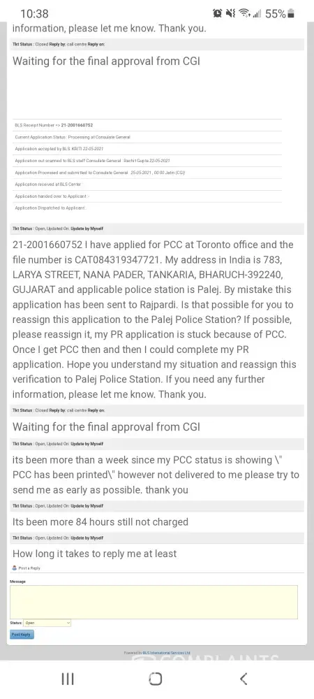 I have applied for my pcc in may and the bls brampton receive within 20 days from back to India.. i was daily checking my mailbox for pcc bt nothing was there. Because i took purolator service so i thought they must deliver my pcc at home. Bt after waiting so long i didn't get anything and i start calling to bls offfice brampton..the employee named aman told me he will disptach it on monday but he didn't do anything again i called them they assure me they will deliver it on the next day also will provide me tracking num .. everytime after wasting my 20 mints to them those [censored]ing people told me that they will ship it today... i reallly don't know what these [censored]ing guys are doing there.. they are not doing their jobs and just earn money in a easy way.. still they didn't provide me my pcc..even ttheri senior are doing the same [censored]..