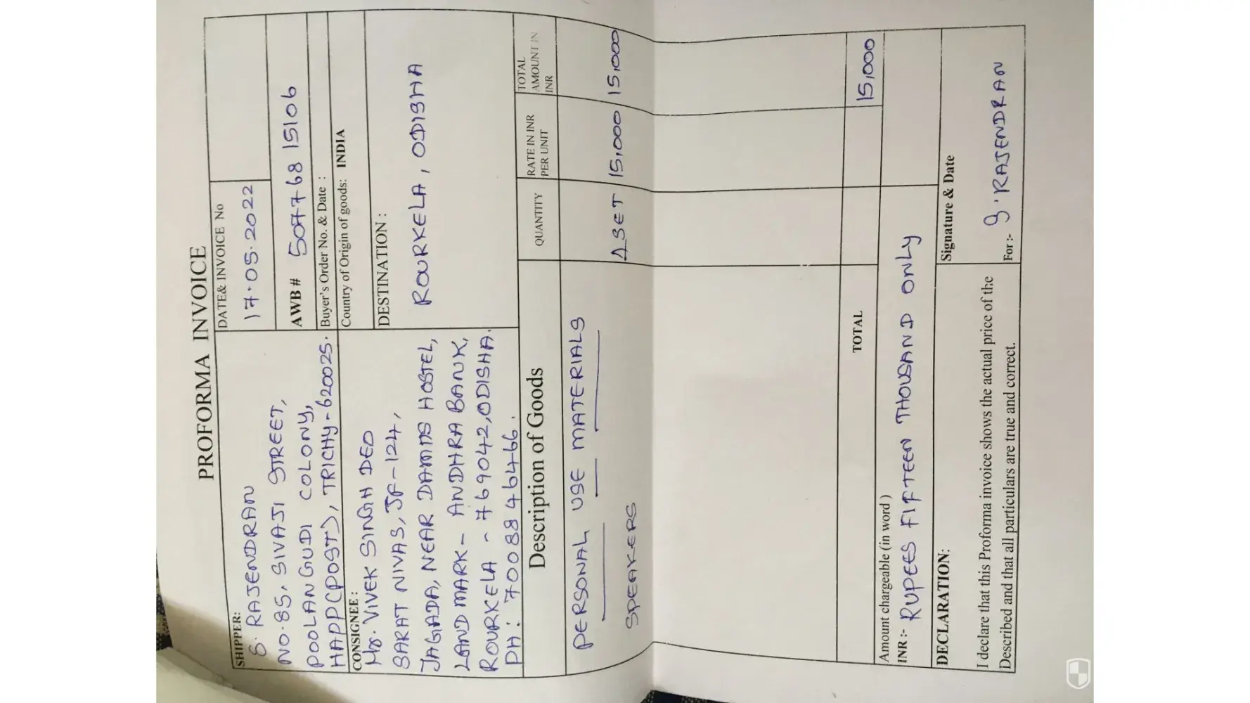 Mr. Sonu # [protected] (Parcel delivered by this person dt. 16.6.22 address is same both shipment)