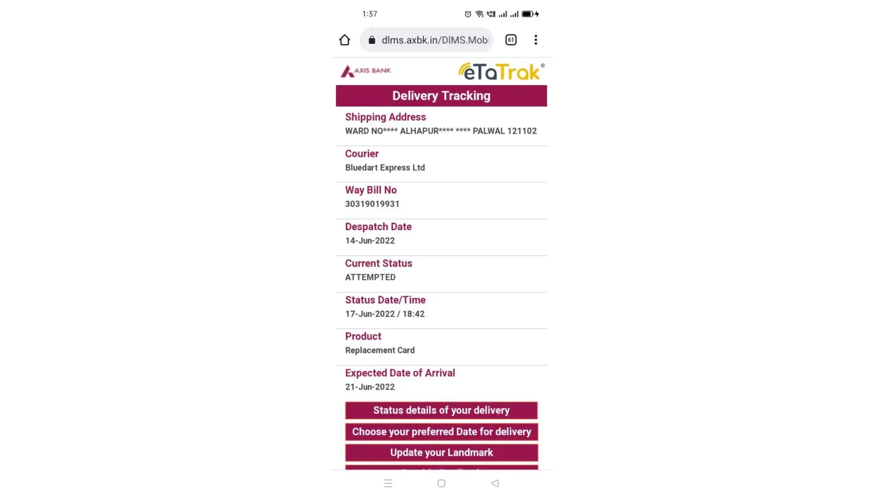 Axis bank debit card / after right address / debit card not received