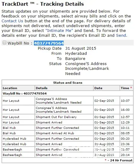 Kindly refer to the attached in which Blue Dart claims to not find my address - my address is complete and they are the only ones who have difficulty in finding my address... They have never delivered important documents to me - my debit card, my banking documents, my cheque book etc to name a few... They are not reachable on phone. They have only updated a bunch of lies and false information on their website in their tracking info (screenshot taken 02.09.2015 @ 10.30 PM IST attached)...