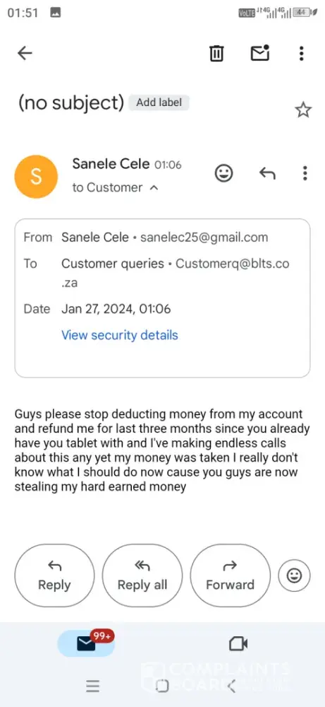 I took out a cellphone contract with blue label connect on 20 November 2023 and I was not happy with the device they delivered and I returned it within 7 days but to my surprise they still deducted money from my account and I called them about it and asked for a refund but nothing and again in December 2023 my account was debited again by them and I keep on calling them and they giving me different stories everytime and today on the 27 January 2024 my account was debited by blue label connect again I don't what to do anymore...is there a legal way I can take