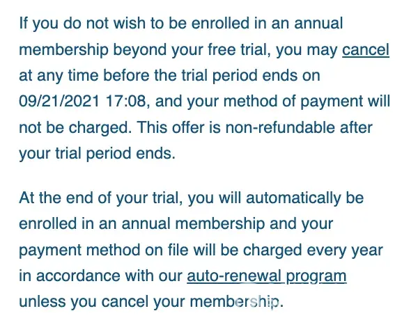 - They make it VERY clear on the page info you're looking at, in their notifications about it, and in follow-up how long your free trial is for and that if you don't cancel the trial before it ends, you will be billed the annual subscription cost, and (unlike many companies) they tell you exactly WHEN that renewal date and time cutoff is.