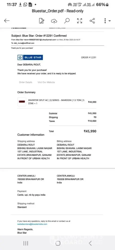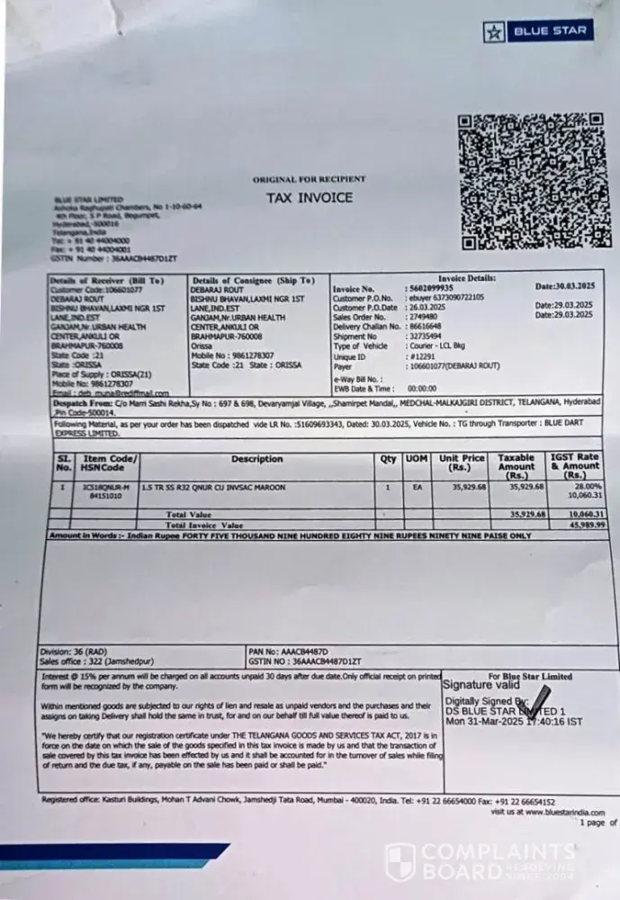I had Order an Inverter Split Ac Q series -Maroon 1.5-ton 5-star AC on 26th March 2025, from Bluestar original verified cite. It was my unfortunate a wrong item was delivered to me, which neither matched with original invoice nor item code and color of indoor unit, which bears white color. That I had purchased directly from Bluestar due to maroon color wa...