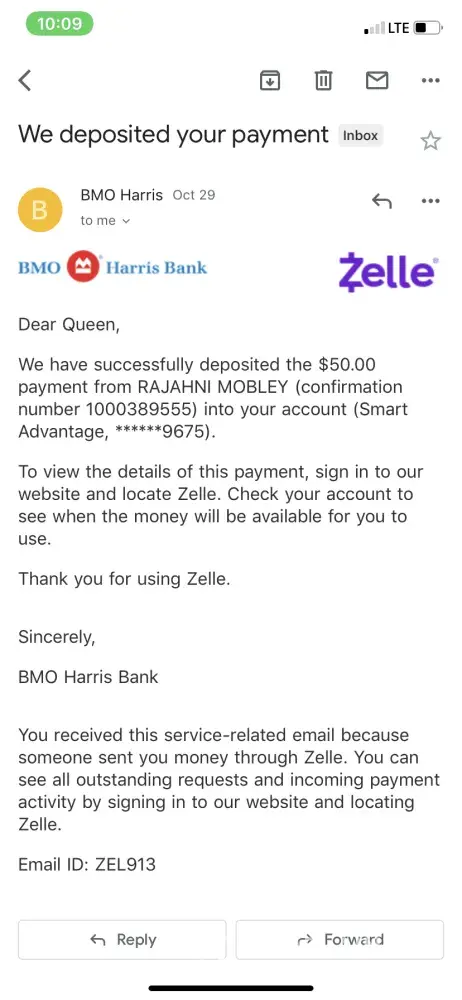 I received a zelle payment of $50 October 29th 2019 went to sleep with $5 left on my account woke up to -$44.68 in my account. I spoke with Diante badge 0333 I was told some how the zelle was reversed(a mistake on y'all side) and the funds wouldn't be available immediately but sometime today. October 30th 2019. I purposely left $5 to be able to eat before I began work(I'm a truck driver) I have a direct deposit for October 31st 2019. Not only is this mistake cutting in on my sleep it also is making me unable to eat which both is very dangerous for a truck driver. How are y'all able to take money immediately from me but not able to immediately reimburse my funds that should've never been touched. How can I trust BMO with large amounts of money if I can't trust them with $5 and I've only been a customer for less than a week.