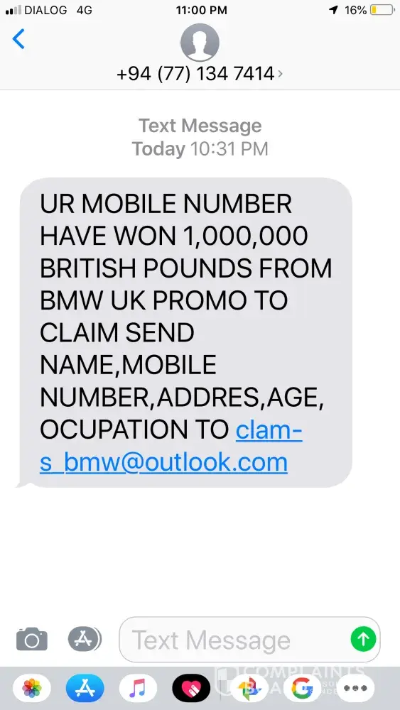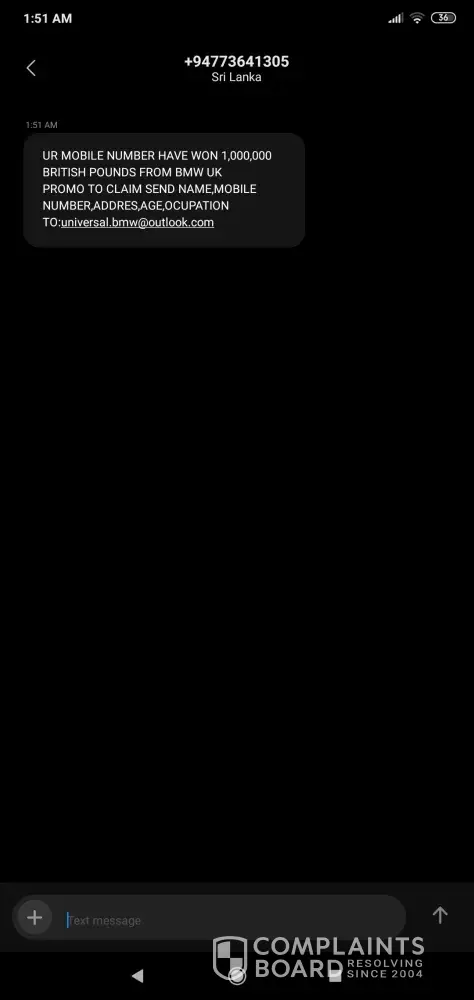 I got a message from your BMW outlook.that I have won a lottery . So I won't to know more about this . Is this true or fake. And they wanted my details.and I've mailed them . And what is the next process . Please .How am I supposed to collect the amount of money from your BMW Corporation. And How many days or months will it take time .iam so happy to Proud to get a Chance like this from your Company. I think I'll get a very positive quick Reply from your Company ? Thank you.universal.bmx@outlook.com for giving me a lottery like this to a lucky person like me .