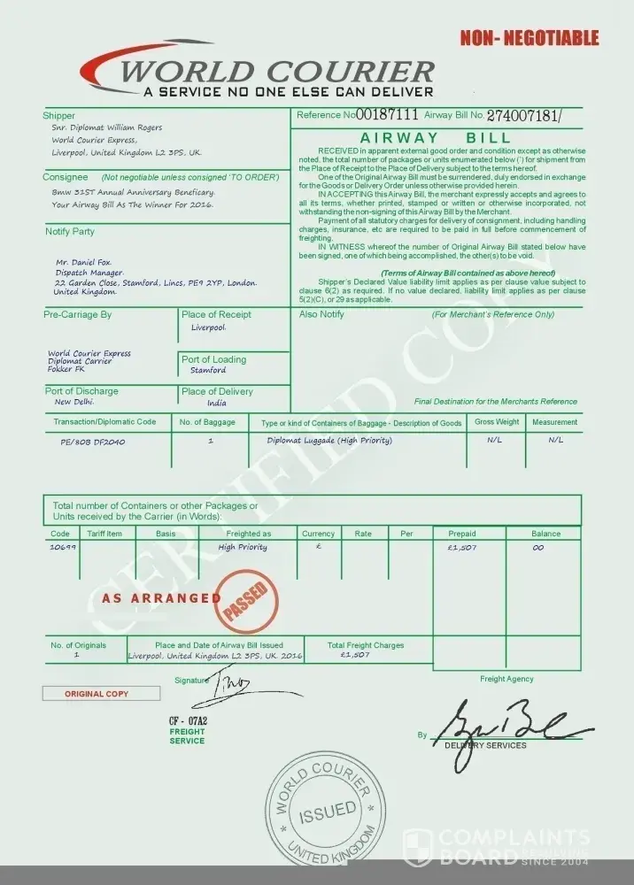 Our delivery agent barrister william rogers from the world courier services will be arriving india on