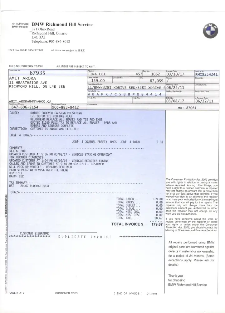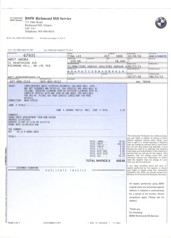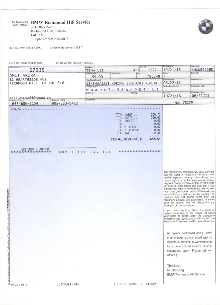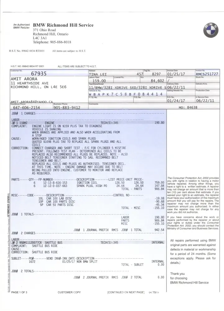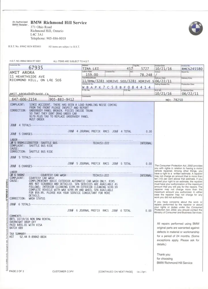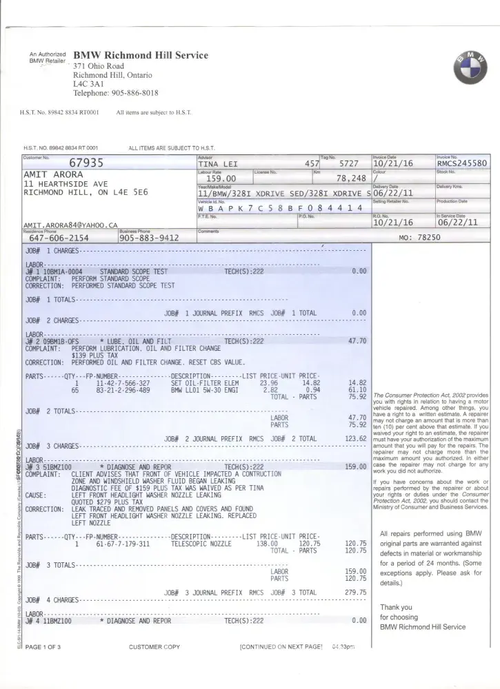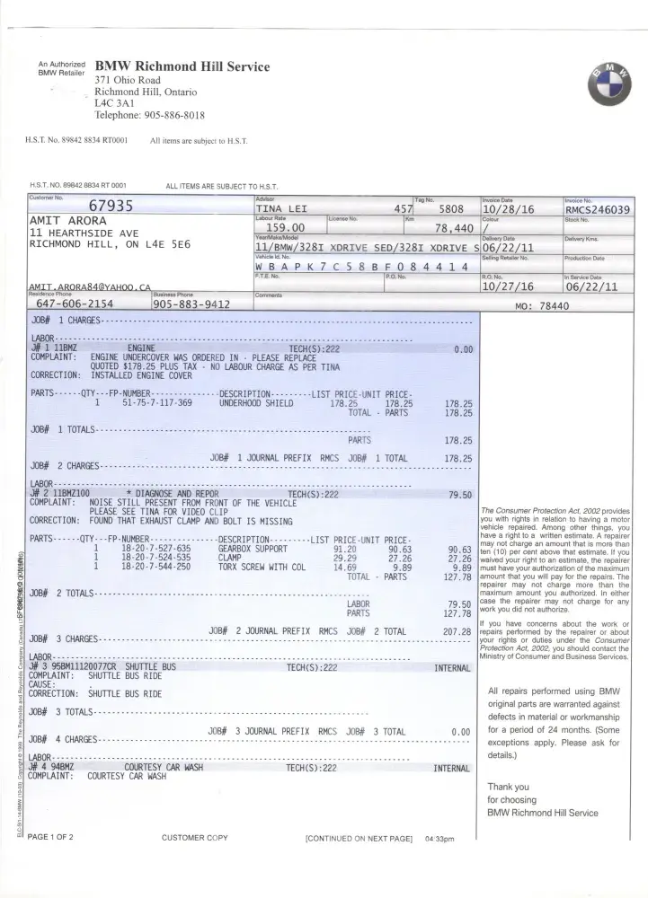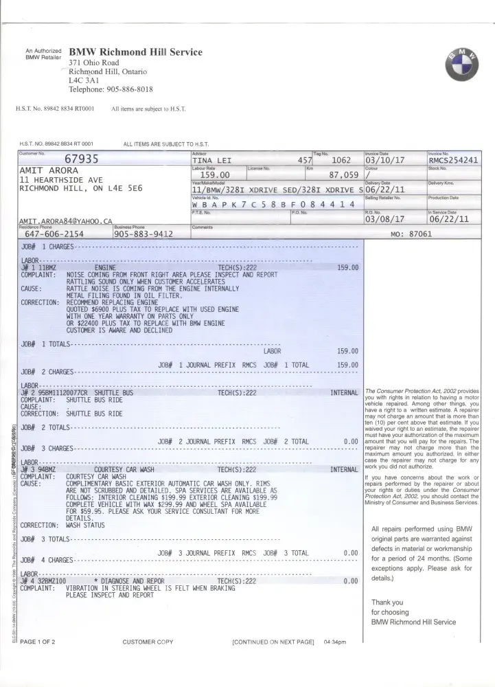 My family has been a loyal BMW cutomer since past 12 years and have been visiting BMW Autohaus at 480 Steeles Ave W, Thornhill, ON Canada L4J 6X6. They advised me to visit BMW Autohaus since I got my first BMW. I purchased a used BMW 328xi in 2016 VIN WBAPK7C58BF084414, and have been going to BMW Autohaus Located at 371 Ohio Road, Richmond Hill, ON L4C 3A1 for all my service needs since then. In October 2016 I went there for an oil change and windshield water leaking, it had 78, 248 KMS on it when the oil change was done, then in January 2017 for coils and sparks plug replacement and then on 8th March I went in again because of a rattling noise coming from the engine when i accelerate. I was advised that the engine has to be replaced and there were metal pieces found in the filter. At this time my vehicle had 87, 059 KMS on it and it still shows 5000KMS left for next oil change. So I thought I should get a second opinion on it. I went to a certified body shop and explained what’s happening, the technician asked me if tensioner belt ever broke, I replied no, so he said he is going to check the oil filter. So he pulled out the oil cap and called me to see that the cartridge and spring were missing a plastic cap with another tiny rubber part that covers the spring. He explained to me that your vehicle has been running dry on cold start as the function of the plastic cap and that tiny rubber part is to bypass the filter when it’s required. As a result of missing parts, your engine is broken and has damaged. He suggested me to contact BMW Autohaus as I got my last oil change done from there. So I took pictures of the broken part and contacted Tina Lei (Service Advisor) BMW Autohaus and I asked her why the parts is missing from the oil filter cap. She asked me to forward the images on her e-mail as she wants to show the images to the manager. I forwarded her the images on March 17th but due to the size restriction of the attachment, she did not receive all the images. So I reduced the size of the images and sent it to her again on March 21st. Tina called me and said that I can come and see the manager on weekdays anytime from 7:30 am – 4 pm on weekdays before April as he will be in training first week of April. So I went on Friday 24th March and had a conversation with the Service Manager (Rad Zonta), Tina Lei (Service Advisor) and the Technician in the manager’s office. The Service manager is quite aggressive and needs to calm down and understand the situation first before calling me in for a discussion. He did not even know what part was missing until I showed him the picture and the technician from Autohaus explained to him in front of me what exactly is missing. This is after having a conversation for about 15 minutes. So, the manager is discussing something with me which he is not even aware of in the first place and showing aggression. The technician claims that even if a BMW is running without a filter and the missing parts (as in my car) it will run fine. He also gave me a good example of a failed motor for the VP of BMW at 7000 KMS. All I asked is that they could have recommended me a replacement for the oil cap as they did the oil change and even after that when my car came in on March 8th. No one recommended me to change the oil filter cap even though it was missing parts. I also asked the manager to see the camera footage for 8th March that will show if my oil cap was inspected properly or not because Tina mentioned to me that everything in the oil cap was inspected properly. The manager also said to me that you believe BMW is a big brand and that is why you came here so that you can get your engine replaced for free, the technician also said even if your oil cap was replaced, you would have come here for reimbursement for that. The manager has no respect for the guest, I have experienced it yesterday and I am very disappointed with his reaction to all this. He certainly needs to calm down and handle concerns as a BMW representative and not get personal by saying to the guest you are here to get your engine replaced for free. I asked them to provide me with a written document which states that a BMW engine will not be damaged if it is missing the same parts as my BMW. I was told it is not a fair request and it was denied. No recommendations were made to replace it at any time of oil change, or at the time of an inspection done on March 08th.