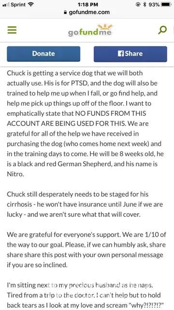 I read every single update on her go fund me and ALL she does is prey on innocent people to make them feel sorry for her in order to get $$$ That's the same thing she did to me, who knows what happened to her "Nitro" all she kept repeating in her emails was "if I were a breeder I would want to know". This was a con job from the get go in order to make me feel like this was my fault so she could get money or a free puppy out of me. When I talked to her vet and he told me that the problem her dog had is not genetic then she went crazy and retaliated by posting slander about me, all because her plan didn't work. That 's why she wouldn't provide me with her vet info/or any vet docs to back up what she was claiming.