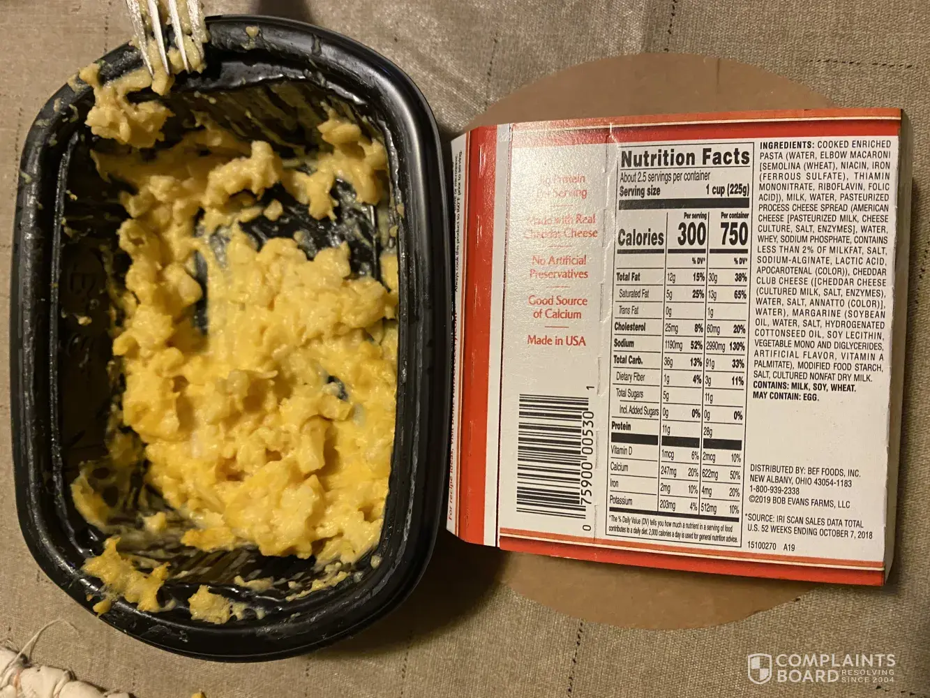 On 02/16/2021, My wife microwaved a 20 oz package of Bob Evans Mac & Cheese. when it was cooking it started to smell foul, it became a watery mess in its plastic container and it didn't look right, We threw it away! I've have had this product many times and never had a problem. the UPC [protected]