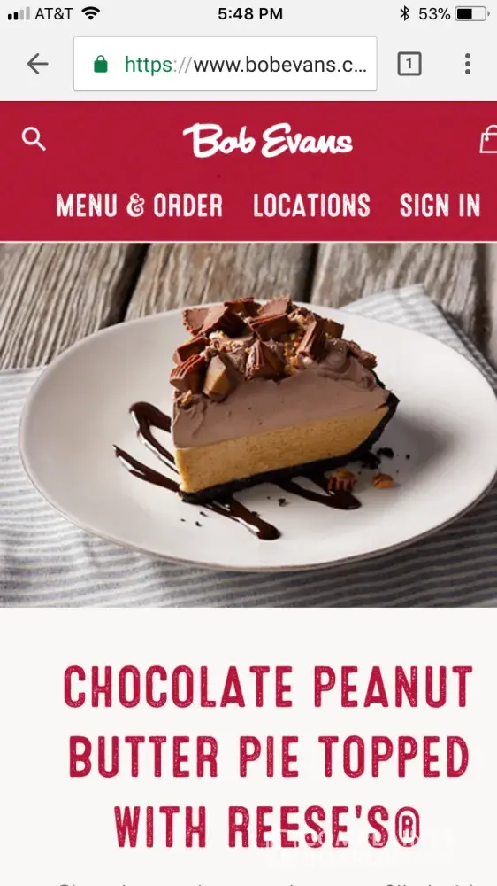 I bought a slice of the Chocolate Peanut Butter Pie and as you can see by the photos Bob Evans advertises a creamy peanut butter filling and chocolate crust. Well as you can, also, see by my slice there is no creamy peanut butter filling and no chocolate crust. This is more like a chocolate pie made in someones kitchen.