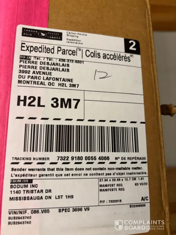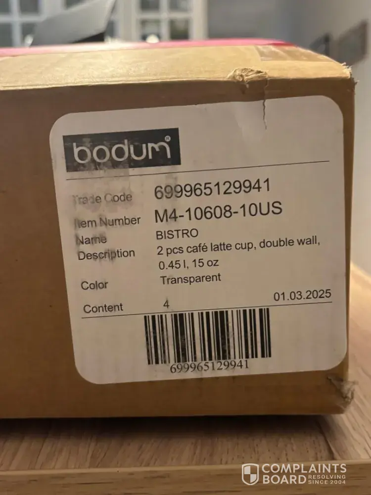 Item # 10608-10US, quantity: 4, Value: $89.90, Shipped via Canada Post. 2 cups were found broken. (One broken cup in each of the 2 boxes) The small Bodum boxes (2 cups each) and the large shipping box did not show any damage. (As if the cups were broken when they were placed inside the boxes). Order # 1900160597, placed on September 1, 2025, Received...