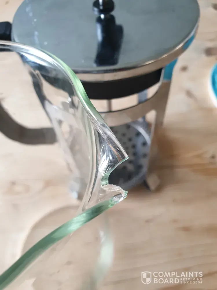 I recently purchased a Bodum Cafetiere online. It had a glass 1 litre beaker jug. Following washing carefully in a basin as usual when I was drying it the pouring recess broke - no excessive force was being used. It left a very sharp edge which was dangerous. I will include a photograph below.