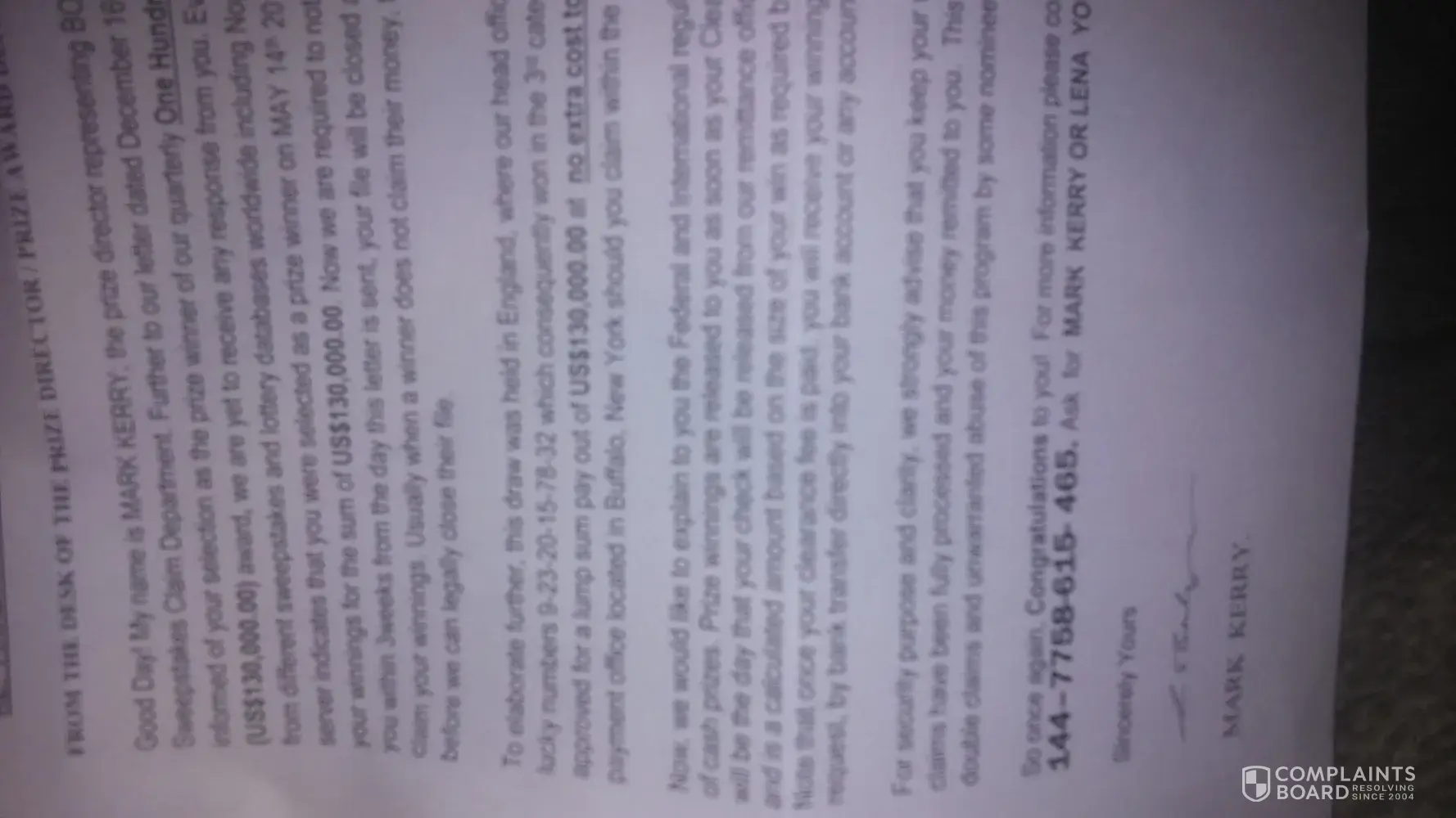 I received the exact same letter and got the same instructions from Mark Kerry. He didn't sound English and was hard to understand. Sounded more Nigerian to me. Anyhow, my supposed winning numbers are the same and I'm expecting my first $5000 within a few weeks. How lucky a I? *lol* I wish we could pursue mail fraud charges, as these people are clearly breaking the law.