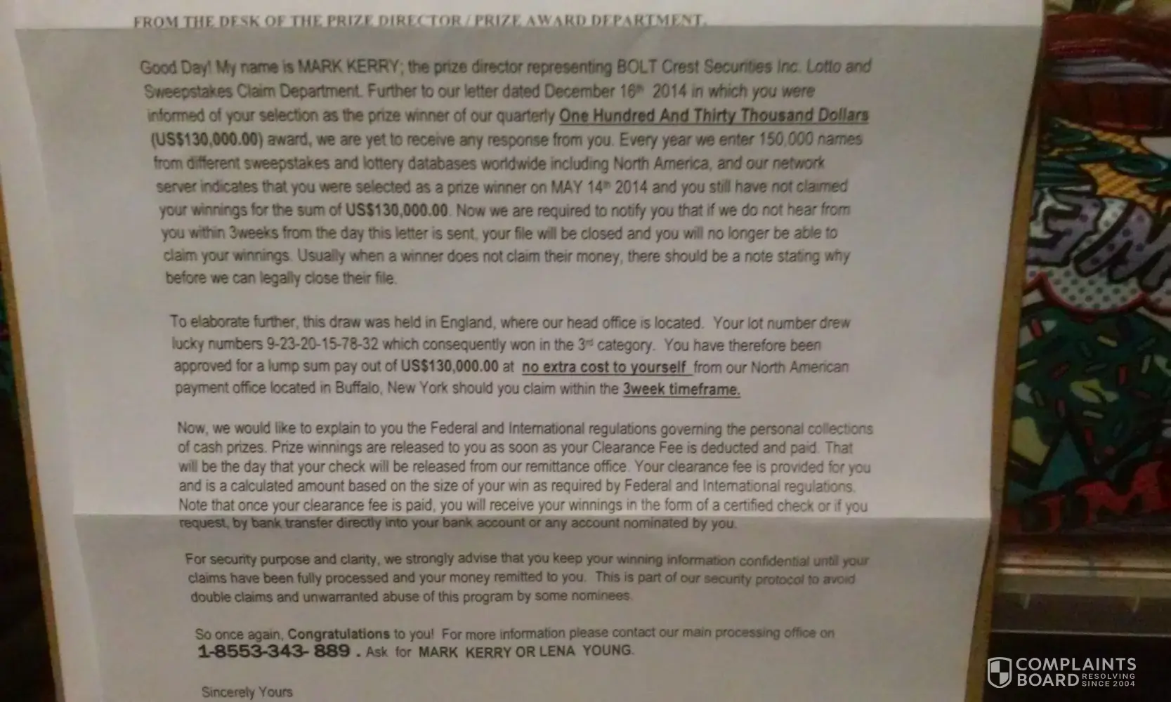 I also just recieved the same letter stating I had won $130, 000 from Mark Kerry, the prize director representing BOLT Crest Securities Inc. Lotto & Sweepstakes Claim Department. The winning #'s were also [protected]. It stated it was the final notification & prize must be claimed within 3 weeks from the date of the letter 12/24/2015. And that I was selected as a prize winner on May 14th 2014. I knew it was too good to be true I could never get that lucky. Glad I double checked! Thanks!