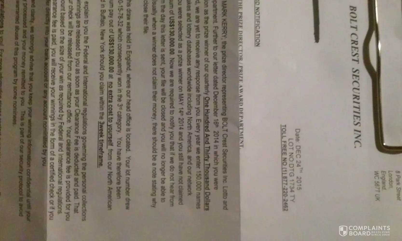 Hi, I just received a letter saying that I won a lottery of 130, 000.00 dollars and when I entered in the same information under CAPE CREST SECURITIES INC. and you will see the same story's on their and mine. It say's to call Mark Kerry or Lena Young and that my winning numbers are [protected] and that I can call [protected] and at the top it say's it's from 8 Park Street, London, England, WC 567T UK LOT NO. DTG 1734 TY Toll Free NO [protected]. You can go to the Cape Crest Securities Inc. to see the same exact stories but with a different company name. Please don't fall for the scam.