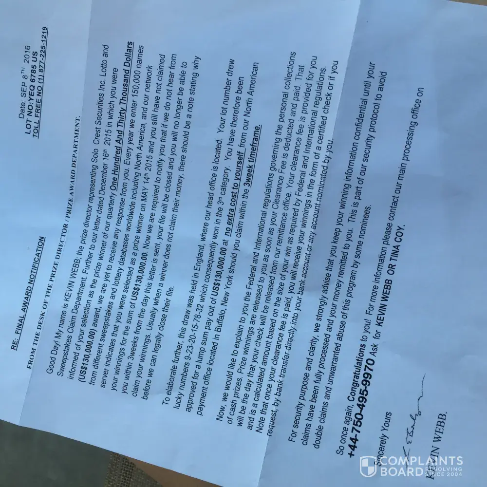 Received the same letter from Solo Crest Securities. It is interesting that it appears that the one thing that they all have in common, other than of course scamming everyone is that it appears everyone someone drew the same lottery numbers.. So sad. All I can say is "Karma is a ###"