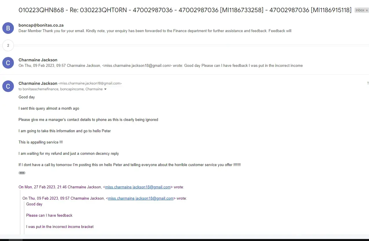 Ive been emailing boncap for a month now as they put me in the incorrect income bracket, the numbers I try call don't even go through. The service is appalling! Still have no response and will be posting on hello peter soon if this is not resolved. They need to refund me the amounts they over charged. I honestly wish I never got this plan as the service or lack thereof is disgraceful! I asked for contact numbers and a manger to call me back, but they clearly don't care. You can even see how many cases are unresolved.