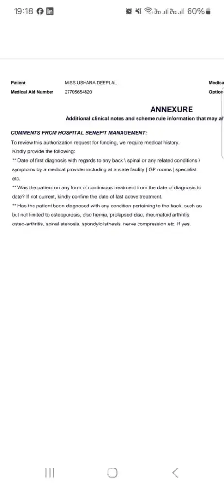 A week later I can not wake up from bed and absolutely in tremendous pain. I contacted my doc sent him my scans, he said I need a spinal procedure. The ladies at the surgery began the process only for Bonitas to decline my auth.