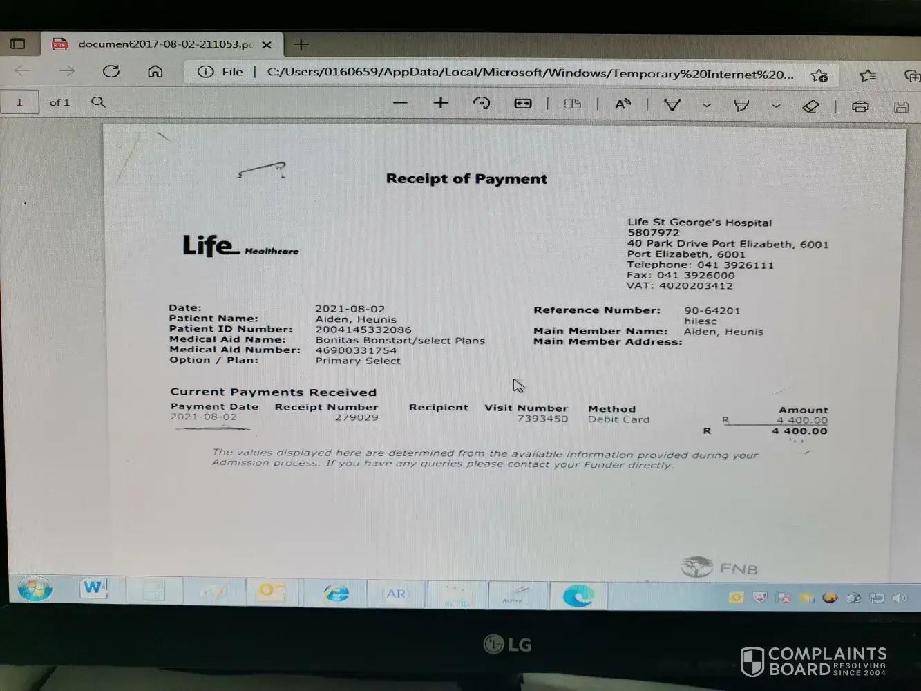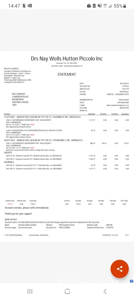 Desired outcome: Outstanding balance to paid to the doctors and claim/Refund of R4400 to be processer