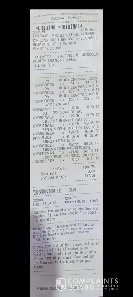 5. I sent in slips for medication purchased at dischem. The levy items can be left out and the other meds looked into under pmb . This is a pandemic totalling R 821.41