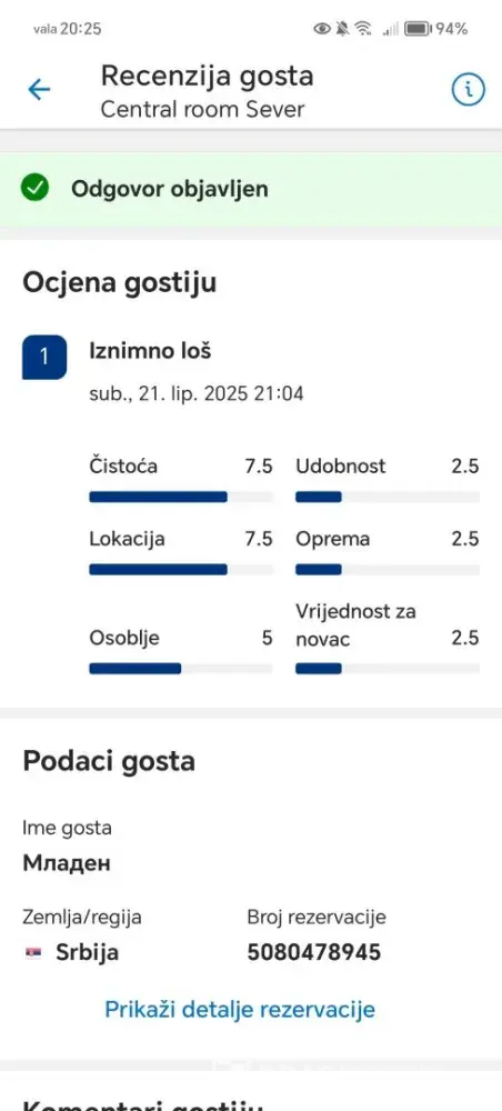 Guest **Mladen Milic** (reservation no. 5080478945), who never stayed at my property, left a score of 1 even though he canceled the reservation himself. I have sent multiple complaints, but Booking ignores partners and does not remove fake reviews. Because of this, I suffered damages and lost trust in their platform.