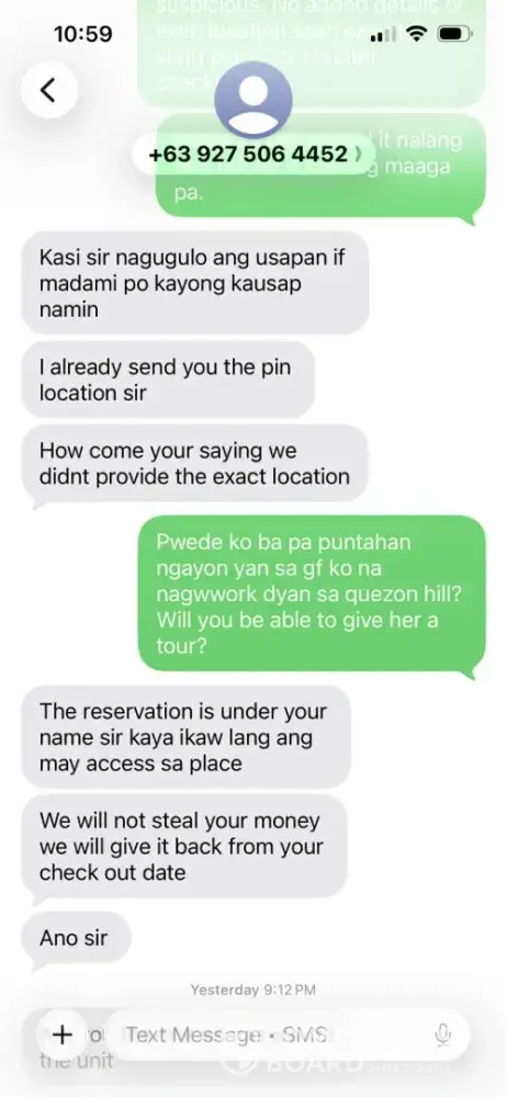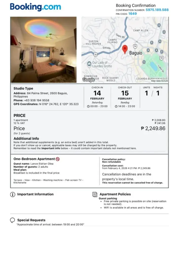 The reservation was made Feb 4, 2026 for an overnight stay on Feb 14-15, 2026 They are forcing me to pay a Security deposit amounting to 1500Php week before the check-in period the Address in the booking was owned by another company but they were claiming its theirs, but I reached out with the real owner of the address and they confirmed that it belongs to...