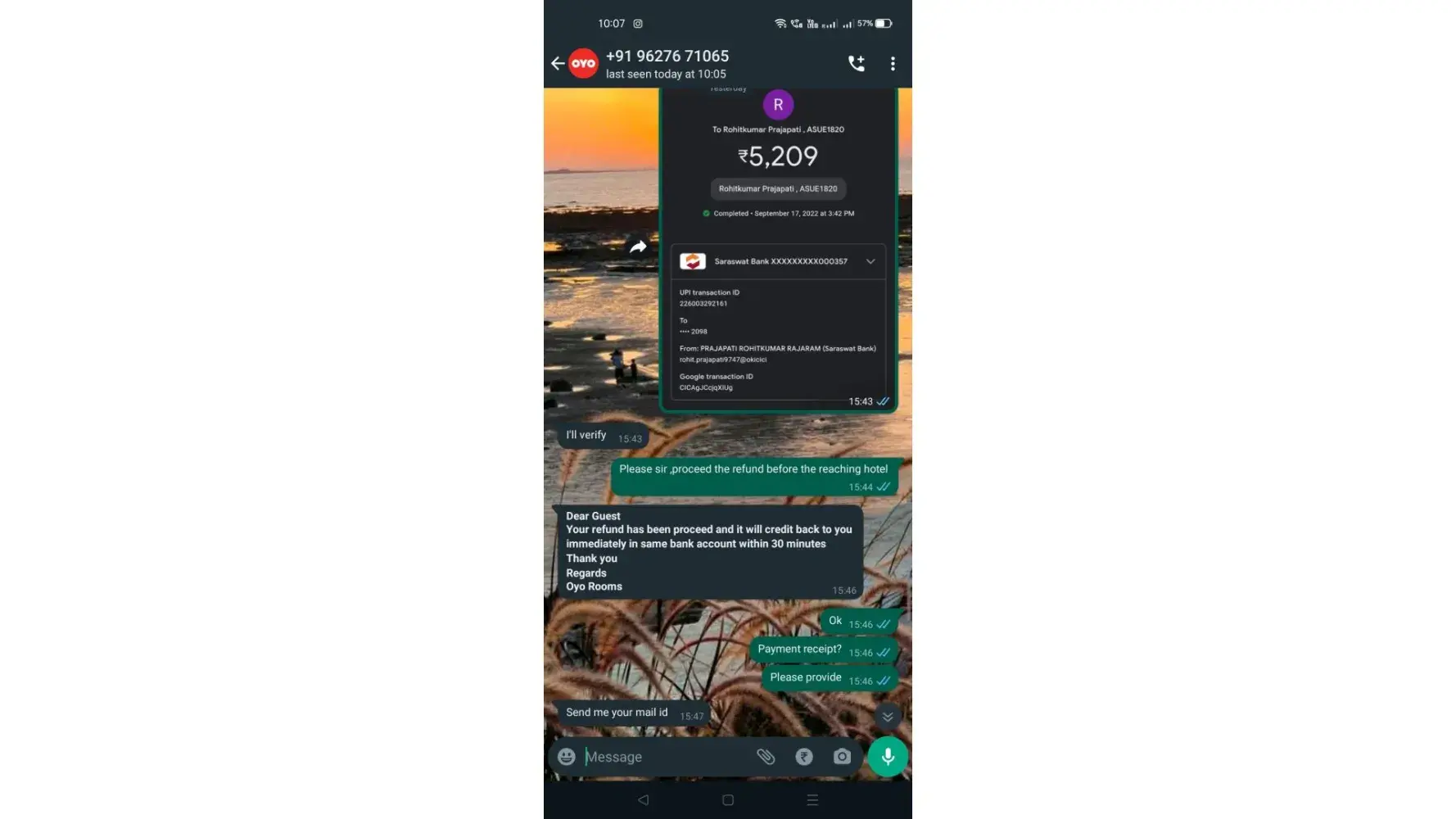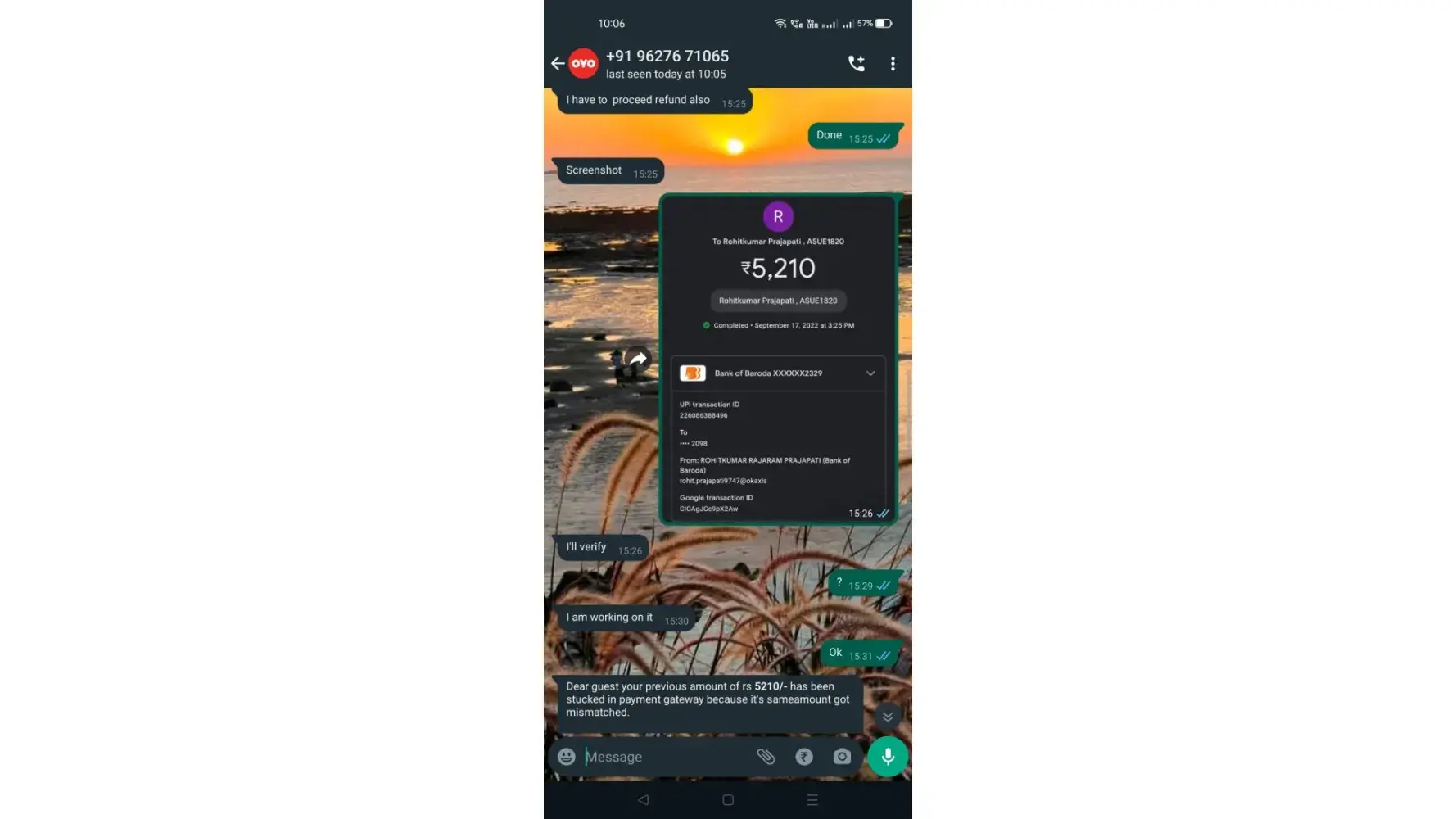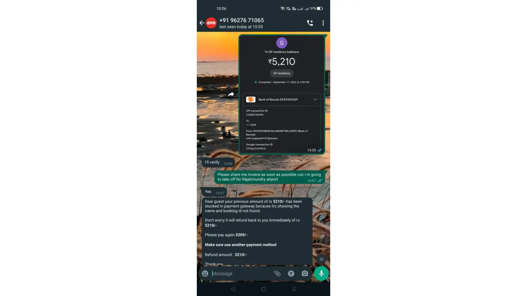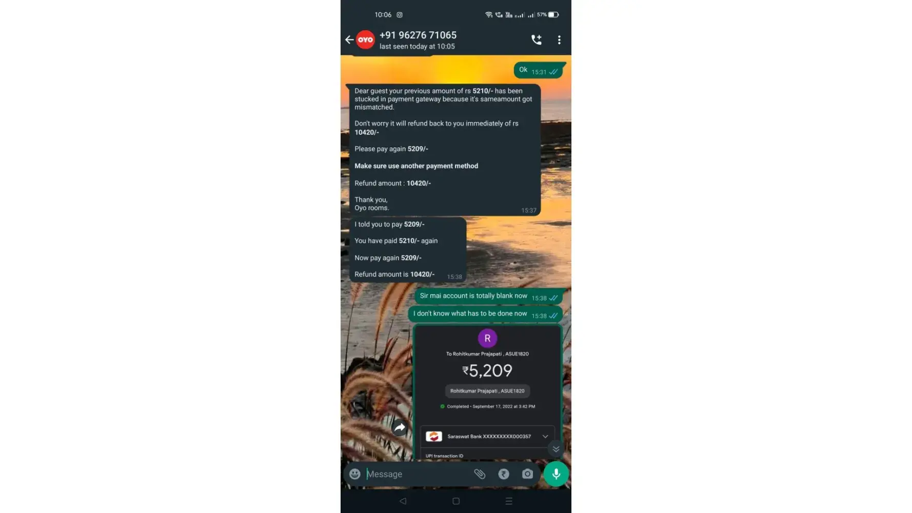 second payment 17th september 5210 which is balanced ---hotel not received but debited from account , time : 2:55 pm