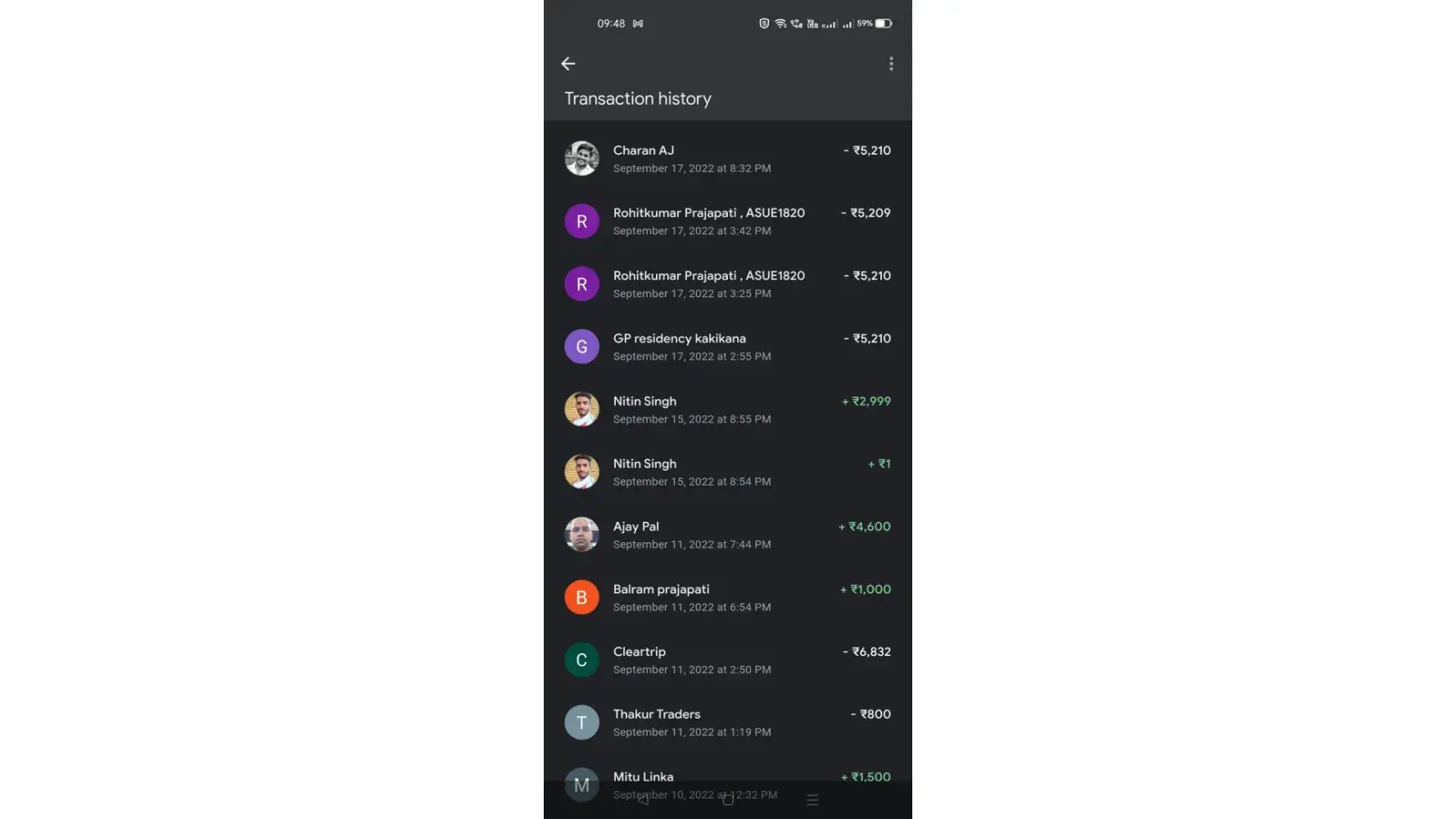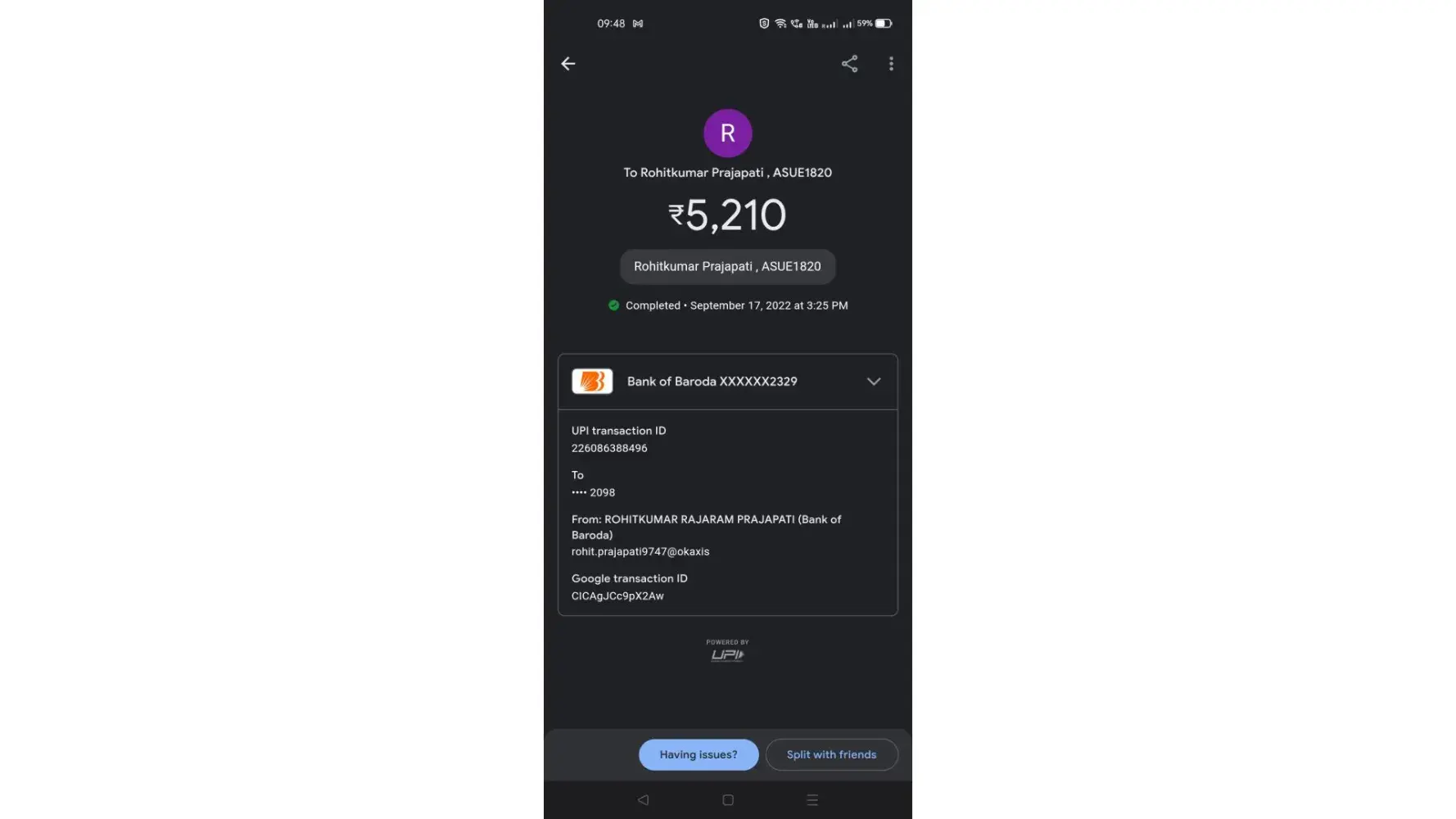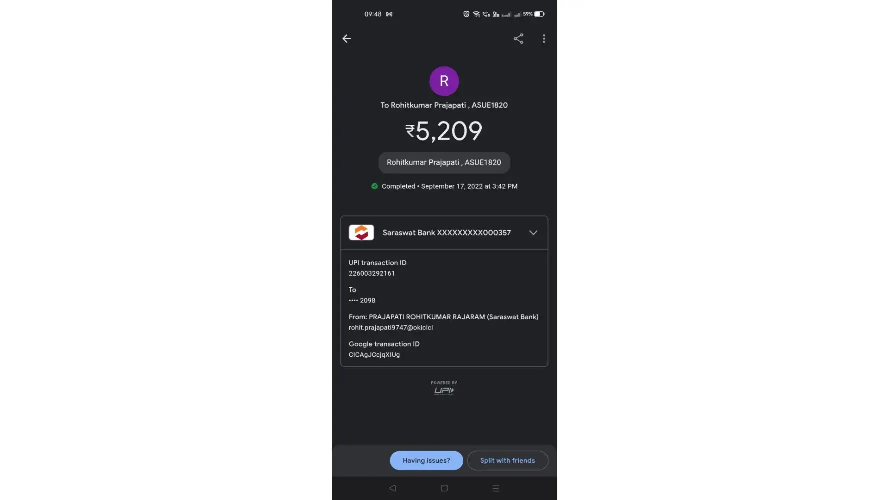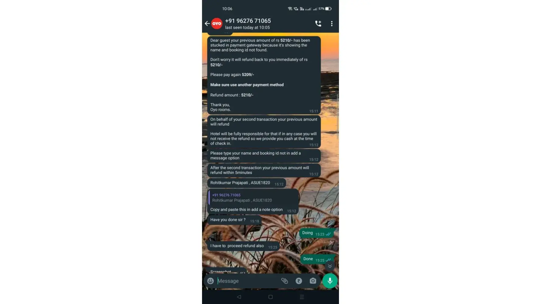 second payment 17th september 5210 which is balanced ---hotel not received but debited from account , time : 2:55 pm