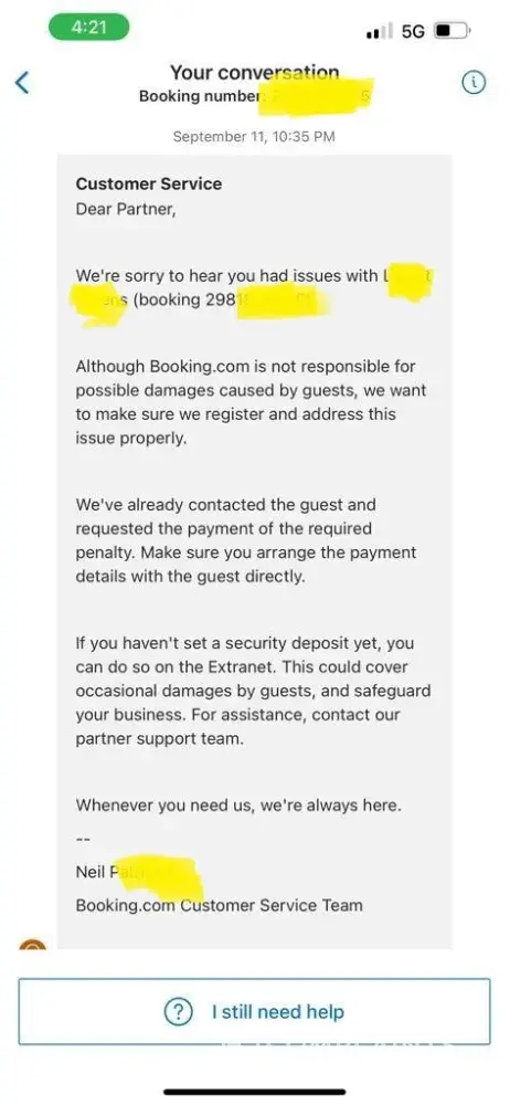 Sadly, we know that the security deposit will not be close to covering the property damaged caused but we would have hoped that Booking.com had our back AT LEAST when it comes to cancelling a reservation and getting to us the money that is owed.