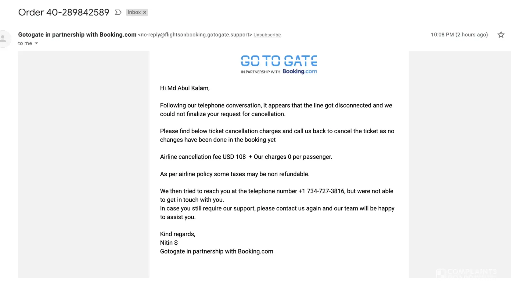 I bought an airline ticket through booking.com flight which I had to cancel few hours later. The booking.com agent I talked to sent me an email (attached) containing information regarding the cancellation fee since we got disconnected during the call. The cancellation fee the agent mentioned was 108$, but later they are now charging me 560$ for the same ticket. This is kind of robbing since I talked with the airline they said within 24 hours, they do not usually impose penalties.