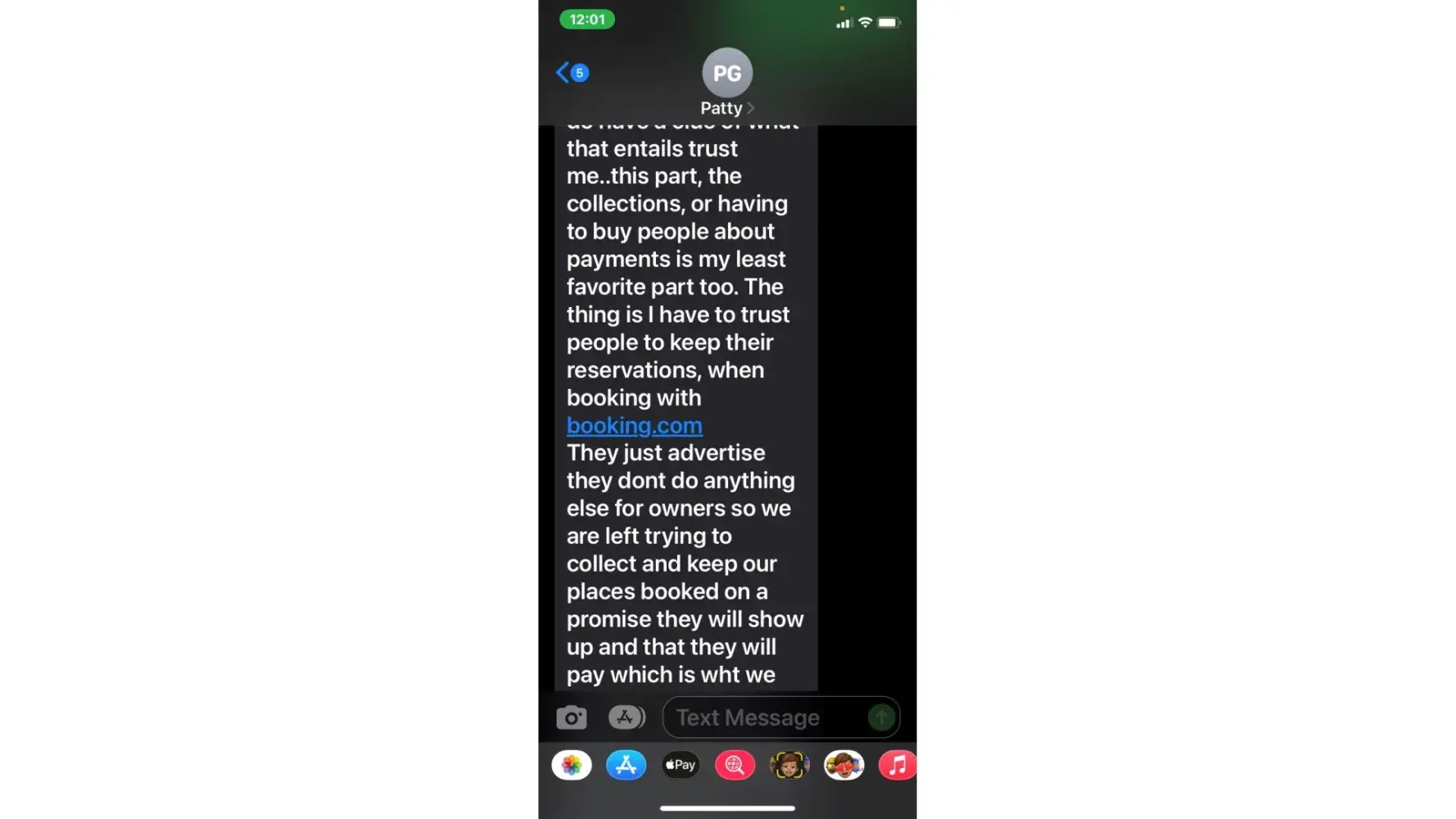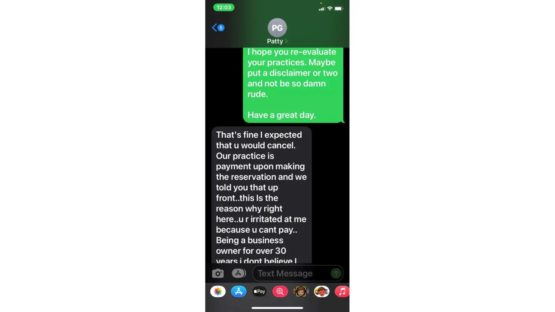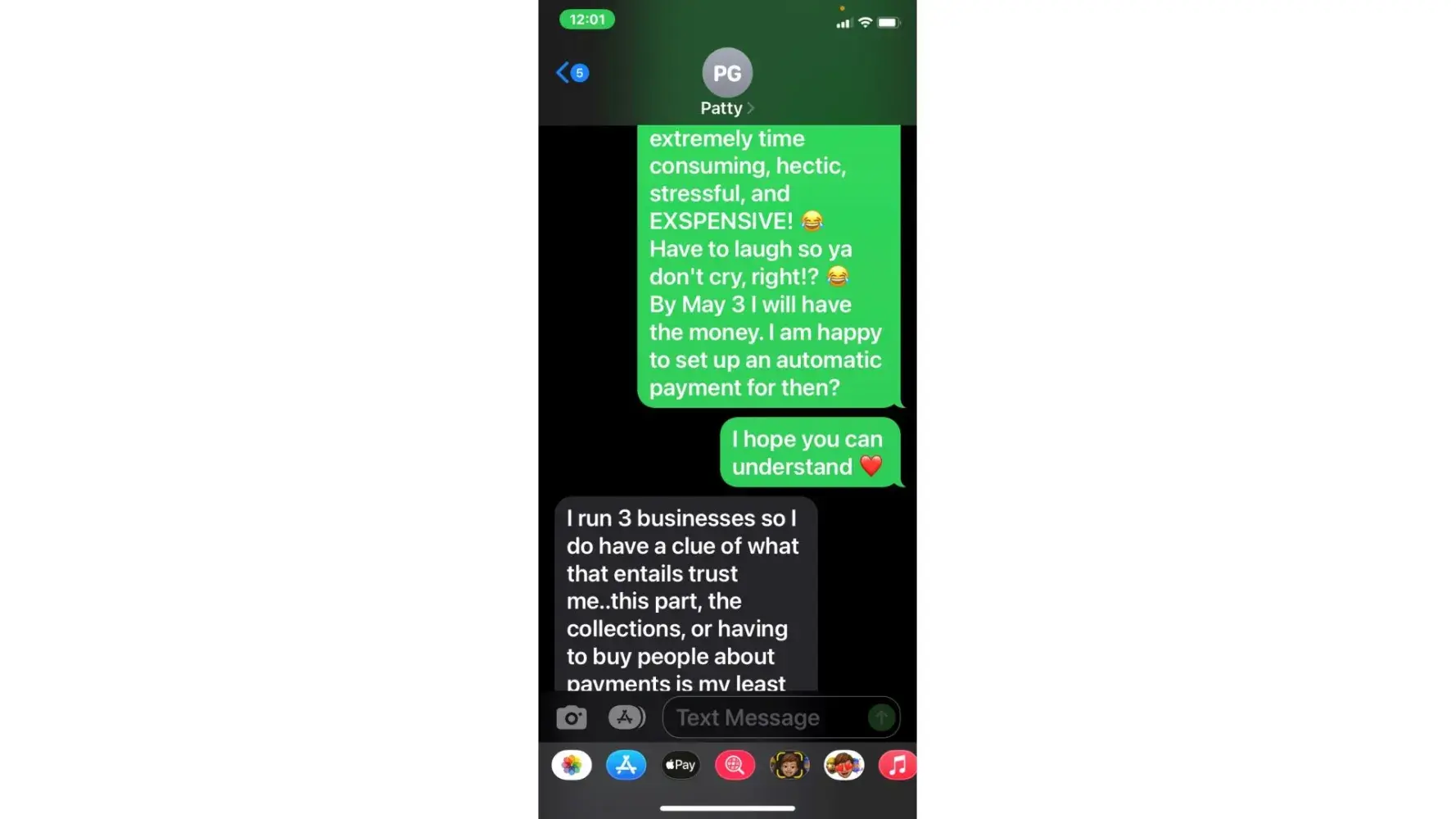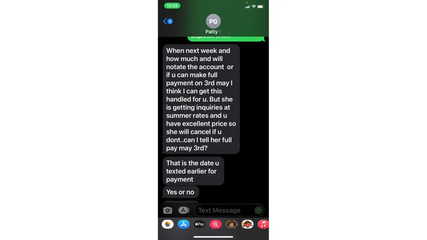 5. when she called 5/3 (the agreed upon date for payment) i was unable to take the call due to being at work. She then started texting me. "is the no response thing again meaning u arent able to make payment today or u dont know what to say? or meetings"