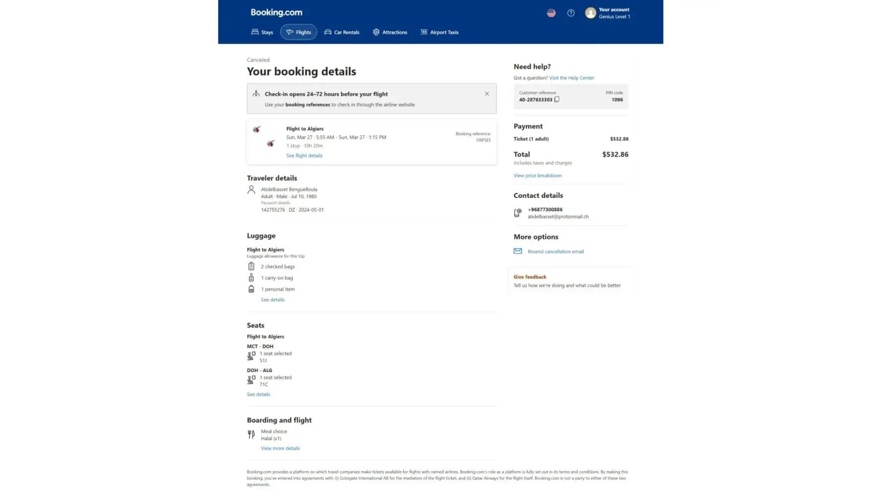 I puchased a flight ticket on booking.com with saoudia airline, I got cancelation information on saoudia app only but not from booking.com. I tried to get refund or flight change from saoudia directly but I just got an e-mail for cancelation of a flight from booking.com. But what is strange is that the cancelationtion is for a flight by qatar airways on 27 mars 2022 Muscat-Algiers, which is obviously not my booked flight.
