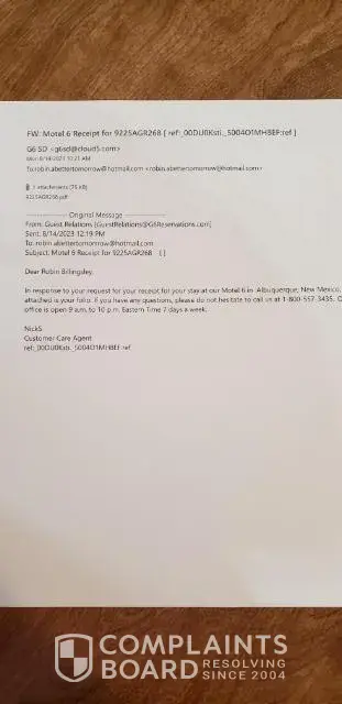 I contacted Booking.com on Aug 10, 2023 since my refund had still NOT been processed by Booking.com. I included the receipt that I had from Aug. 3. The refund was still NOT processed by Booking.com. I kept getting text messages from Booking.com that I had to make Motel 6 Alburquerque south provide proof to Booking.com that they had, in fact, processed the refund. I HAD ALREADY PROVIDED THAT TO BOOKING.com.