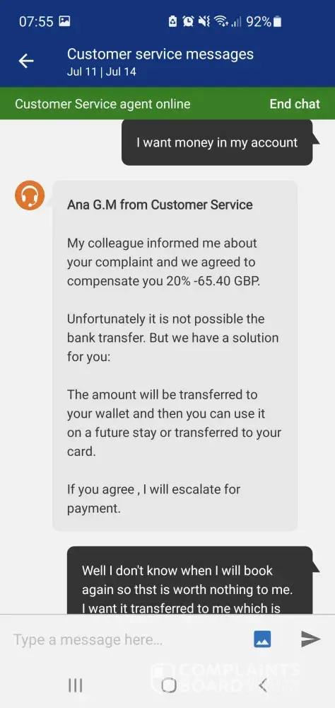I have been in contact with customer services via email since the 7th July in relation to a booking I made with them back in February this year