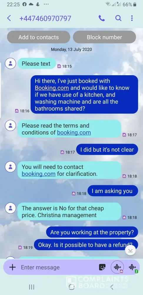Of course we would have gone otherwise. I know it was only £140, but thts a lot to us being pensioners. Any way, booking .com advised us to email the owners, which i did but booking.com intersepted it. It must have got through, because i did recive an email back from him saying, there was not a lot he could do, as he didnt get paid from them until the day of arrival.