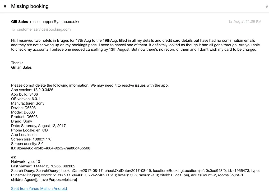 I reserved two hotels in Bruges but received no confirmation emails so couldn't cancel them in the free cancellation time (30mins left to cancel for one hotel), before incurring charges from the hotels. I emailed Booking.com customer service at 11.09am immediately after making the bookings to find out where the reservations had gone, they were not in my 'manage bookings page'. The only response I had was automated asking for a reservation number which I couldn't provide. I looked for the customer Service number and couldn't find it on the Booking.com app (I was on my mobile).