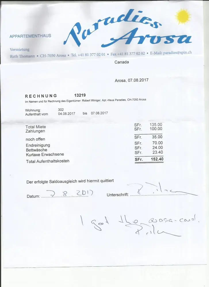 I booked Paradies Apartment in Arosa because they advertise it as sale for 180 CAD (CHF135) for 3 nights in big font so it showed up in my filtered search with max of 60 CAD per night. When I was leaving hotel they charged me on top of deposit of 100 CHF additional 152.40 CHF which total to 252.40 which exceeded the initial price nearly twice threatening that otherwise they would charge the rest from my credit card claiming that 117.40 is a cleaning fee for 3 nights of staying.
