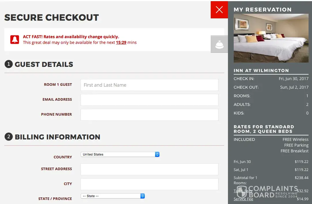 I was tricked into thinking I was confirming a low rate on Booking.com's website. On Monday, 6/26/17, the booking.com website listed a rate of $64.48 per night for a stay at the Inn At Wilmington for two nights: check in 6/30-check out 7/2. They have an intrusive sidebar pushing other travel-related deals on their "Reserve" page. Of course I clicked the "x" to get rid of it to see the rates suggested. Once you click the "reserve" button, again it's a new screen with the same pop up sidebar. I clicked the "X" again without care--there it showed in small type that my $64.48 rate was actually $119 plus fees. no where else on the page! When I clicked "confirm payment" it jumped me to a screen that showed $286 had been charged to my credit card. I called immediately to cancel. They informed me that I would be charged $14.99 for the privilege of using their sneakily deceptive site. The customer service rep, clearly on a word track, did nothing but let me know that my refund, light $14.99, would probably show up in 7-10 days.