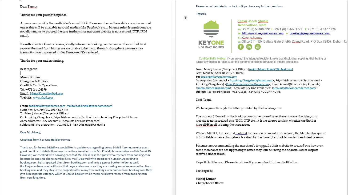 But probably guest went in the Bank (National Bank of Abu Dhabi) after and submit the complain that we charged him wrongly, so Bank wants to take money back and not accepting any evidences from as and from Booking.com (Policy latter that guest agreed). The bank is not admit the Booking.com as a secure company, For me this is very ridicules and unexpected, as we are old client and working long time with booking.com. Please, be informed as well that we were communicate with local office of Booking.com, but nothing is changed and they admit that Booking.com is unsecured company!. We can provide all Email communication.