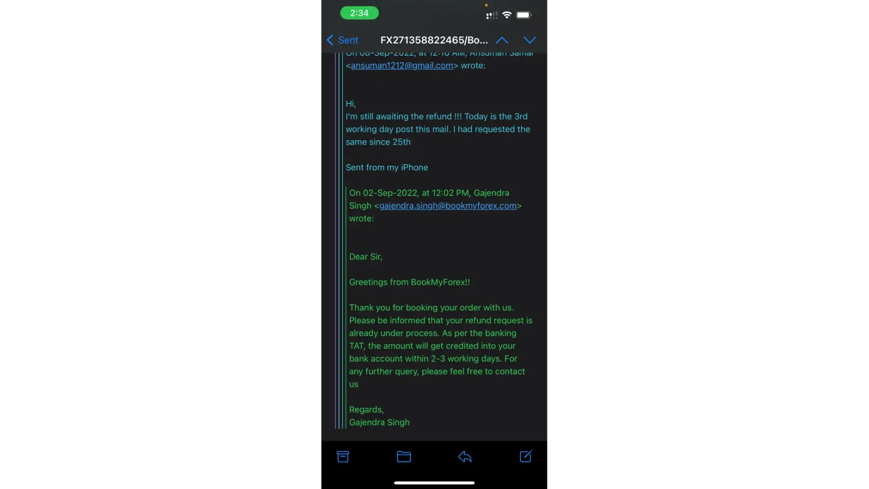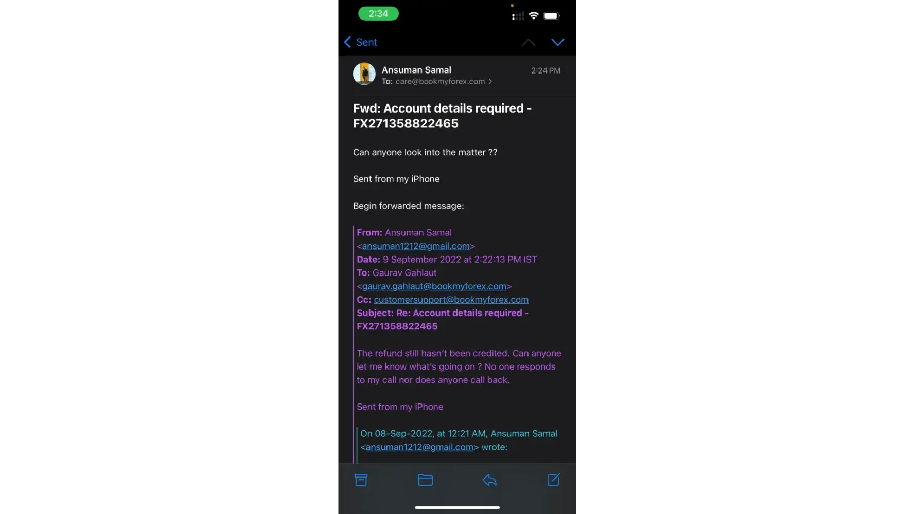 Then an agent from bookmyforex called me on 21st September, 2022 at 6:30pm assuring full refund and asked me to share account details. After that I did not get any information wether the refund was initiated or not, also the transaction number through which i can track. I have sent multiple emails but there was no reply. The customer care is absolutely worthless and is causing distress.