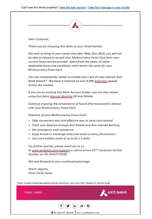 Myself Bhupesh Seth, Purchased A multi currency forex card from Book My Forex.I have HKD In my Card and Now Wanted to load GBP Online.But Unable To do so.When I bought this card I was told that any currency can be loaded online.But Today on talking to CC They told that their contract with AXIS Bank is terminted now if I have to load currency I have to visit bank personally and do the needful.
