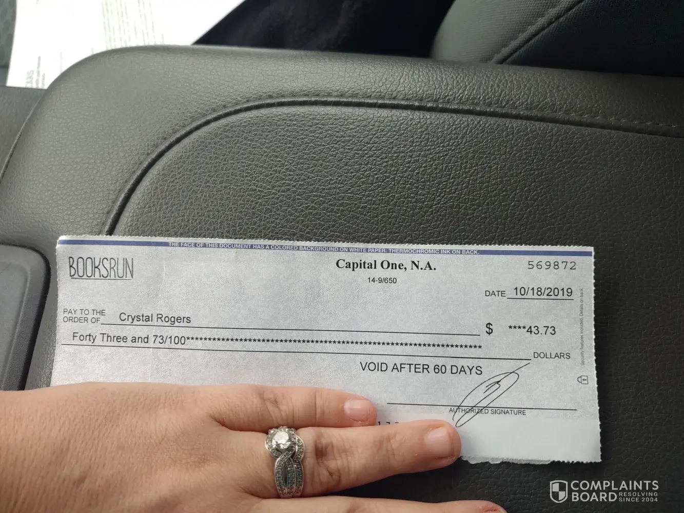 Received check for 43.73 on 11/04/2019 that was cut on 10/18/2019 when I went to Capital One, N.A. to cash the check the bank informed me that their account said it was not set for positive pay. I called the customer service number and was told they would research with their bank why it was saying that and would get back with me in 2 to 3 business days. I advised them if I do not have my check reissued and overnighted to me tomorrow or have not heard of it being turned to positive pay then I will be researching to press fraud charges as they knowingly sent a check out for products that they knew would not be cashed.