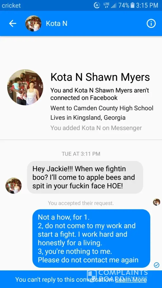 I, unfortunately, am a relative of this employee, and I do not appreciate how this young woman has spoken to me. I've included the conversation. The last two photos are her fake facebook she made, just to harass me.