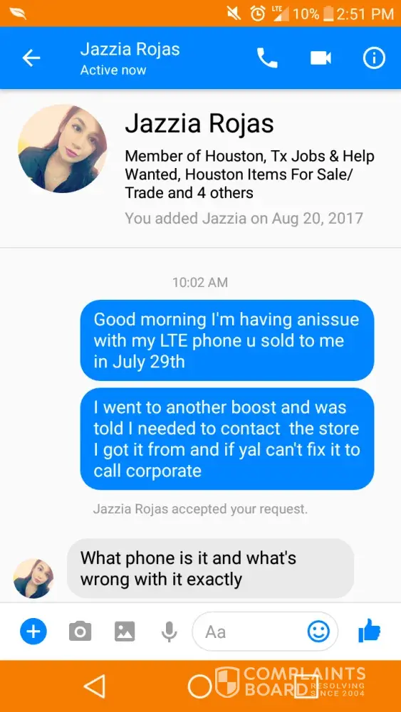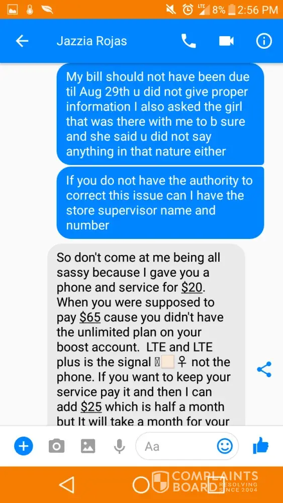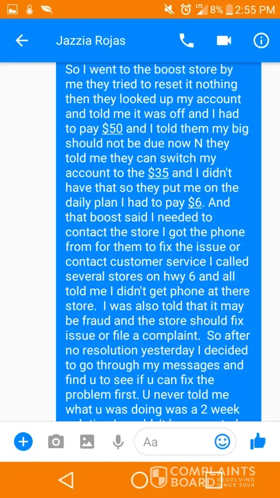 I was informed that the store locsted on hwy6 s was running a promotion all you had to pay was $15 and you would get a free phone and first month of service if you switch over to boost so on sat july 29th i drove 30 mins from my house to this store and was then told the only way i can do it is if im added to a boost account that's already activated i advised her i dont know anyone with boost at this time. She said let me see what i can do. She did something i the computer and said okay you pay the $20 today and your monthly bill will be $50. So im like okay cool. I get a text message that said i was removed from a family plan and my monthly bill is $50. I didnt think anything of it because that's what she told me my bill was and i knew it was not time to pay my bill yet. So today 8/19 i wake up to run some errands and i needed my gps but i would not pull up so i factory reset my phone because i thought something was wrong. But it still didnt work i tried to send a text and i got an error message that said "BSTFreeMsg Text message not sent due to low balance. Recharge account. To find Re-Boost Location from handset go to Web then Re-Boost Locator."