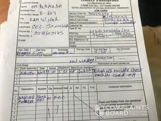 (d) The machine got defective on 18 Nov but I could report it only on 26 Nov since I was out of station from 19 Nov to 25 Nov23. The defect Dryer Module defective was diagnosed by Mr Gurveen of ---. On changing the module, the machine did not work and he further diagnosed that Invertor Module was defective. The cost of module was quoted as Rs 9540/-.