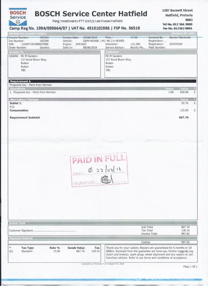 On the 10th august 2018 I took my vehicle to gwm/haval in hatfield pretoria, due to me having lost my keys for the vehicle. They have a bosch service centre which does all their vehicle queries. I phoned them stating my problem and then they said I need to bring my vehicle to them and they will sort it out for me.