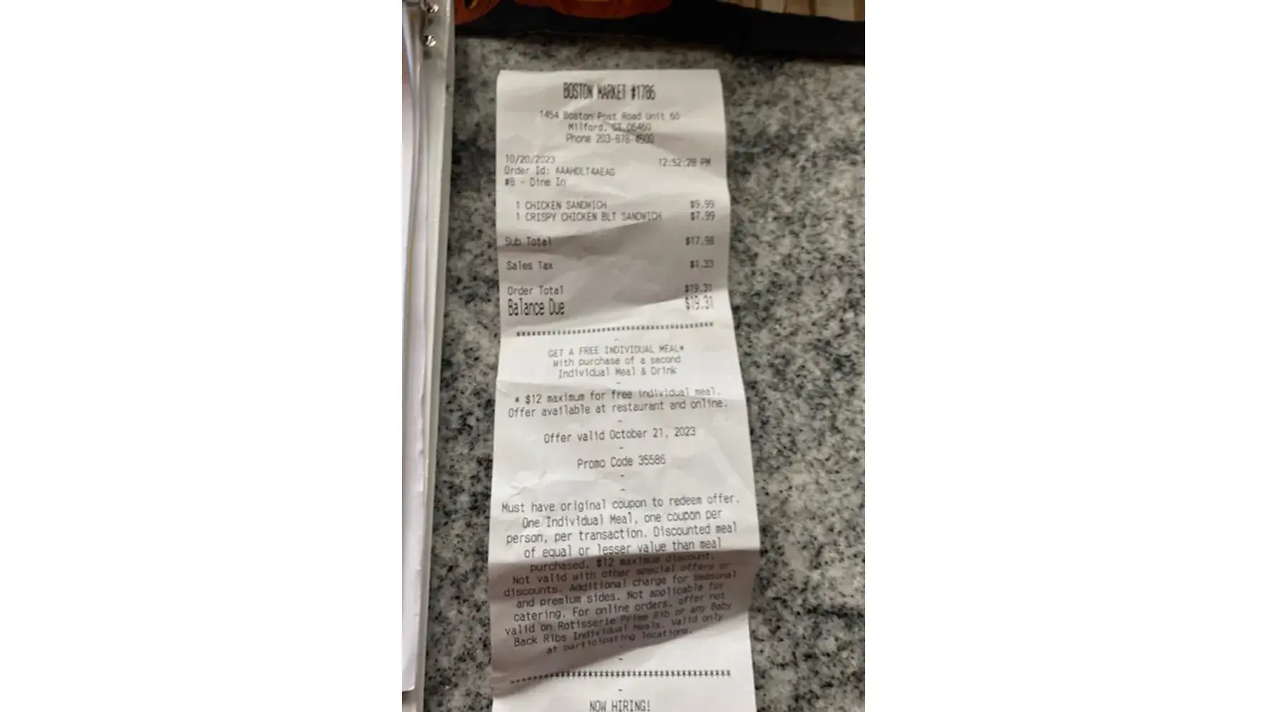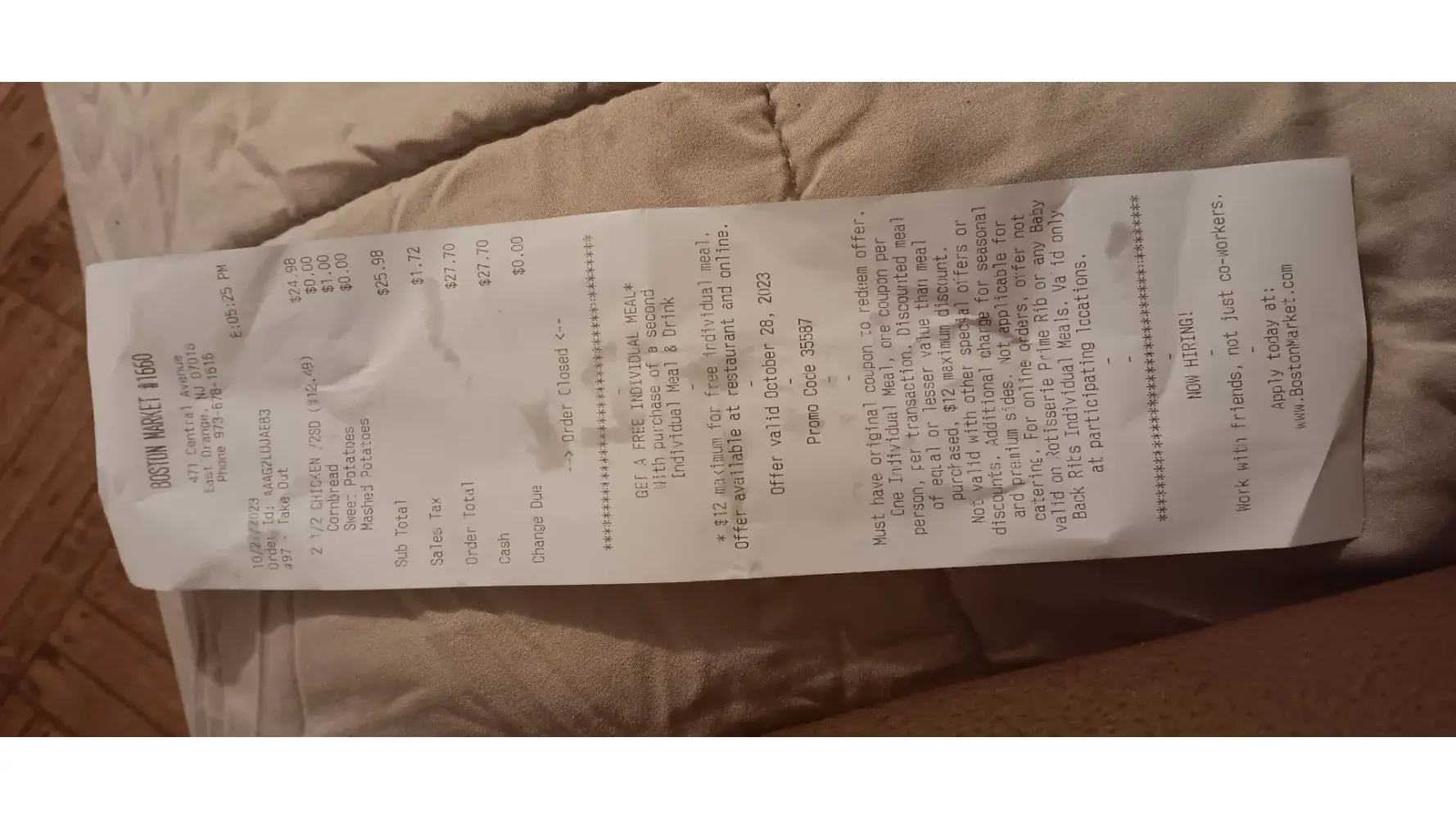 I just left from a Boston market on 471 central Ave today is 10/27/2023 8:05PM I ordered 2 half of chicken meals with mash potatoes and yams my total was 27.70 order Id is AAAG2LUJAEB3 Take out 97 The food is horrible it does not taste like boston market its trash so I went home to give a bad review to see the store is closed how is the store close if I...