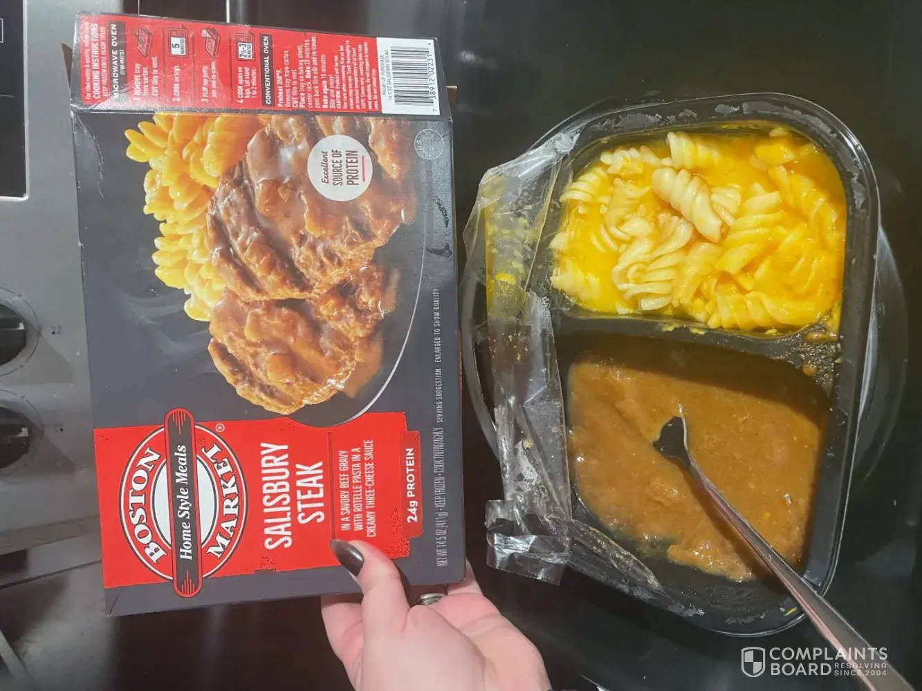 My son was looking forward to having it for dinner, so we prepared it exactly as instructed — cooking for five minutes before flipping the patty. However, when we went to flip the patty, we discovered there was no Salisbury Steak patty in the meal at all. The tray only contained macaroni and cheese.
