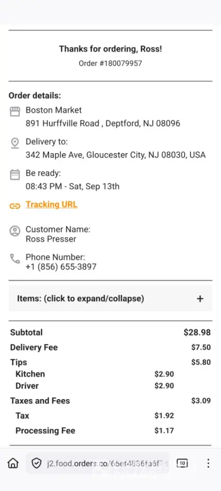 ordered at about 8:30 p.m from deptford, New Jersey store. order apparently placed through the orders.co web page. I watched the live tracking page switch between driver and driver from Uber eats. finally, at 10:14pm I called the driver and she said she was at the Boston market and the doors were closed. which makes sense because 9:00 p.m. is the closing time. there is nothing on any of the ordering pages that will help me submit for a refund or anything? very upset.